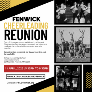 Join us in reuniting the Fenwick Cheerleading Family from all generations! Complimentary entrance with hors d’oeuvres, cash bar, games and music. - Please RSVP by April 3rd - If you have any questions, please contact Fenwick's Director of Alumni Relations, Sarah LoPresti, at SL@fenwick.org or 978-587-8325